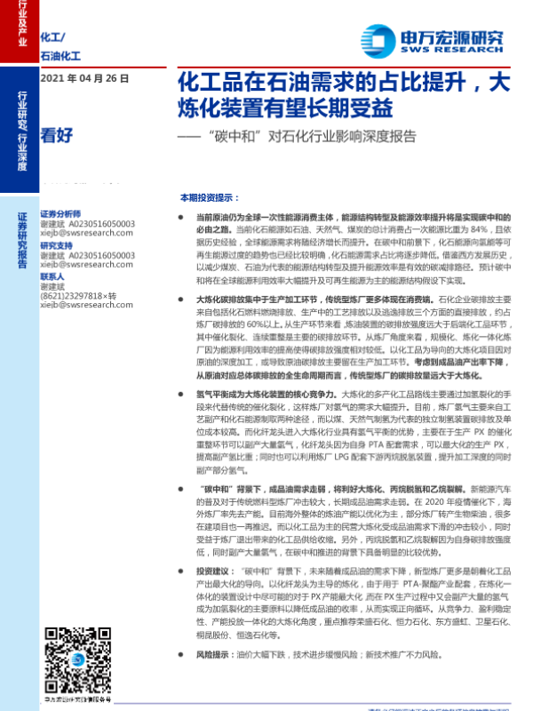 【申万宏源】【20210426】“碳中和”对石化行业影响深度报告:化工品在石油需求的占比提升,大炼化装置有望长期受益-27页