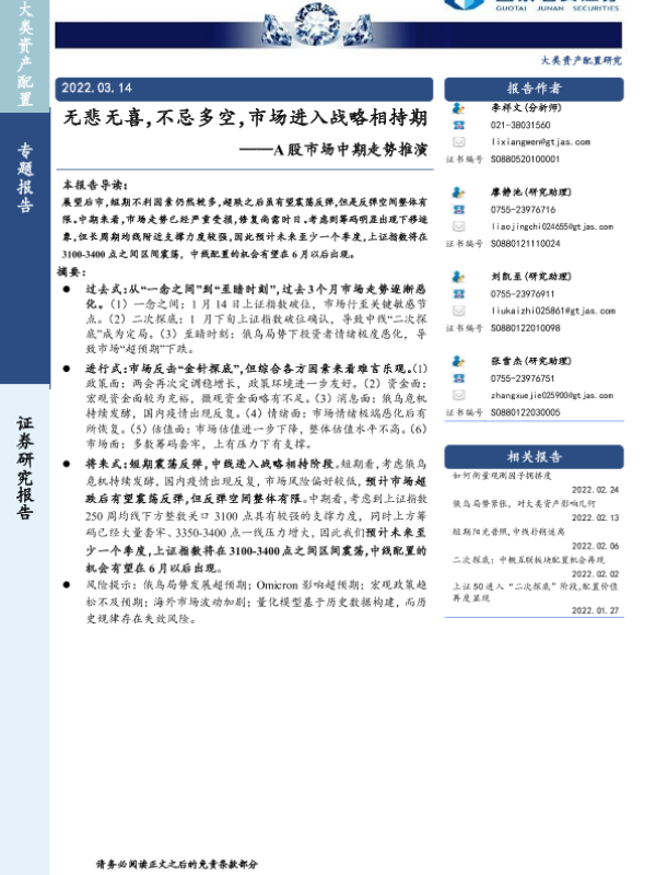 【国泰君安证券】【20220314】A股市场中期走势推演:无悲无喜,不忌多空,市场进入战略相持期-15页