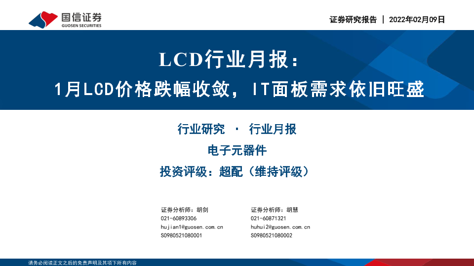 【国信证券】【20220209】2022.02.09-LCD行业月报:1月LCD价格跌幅收敛,IT面板需求依旧旺盛-24页