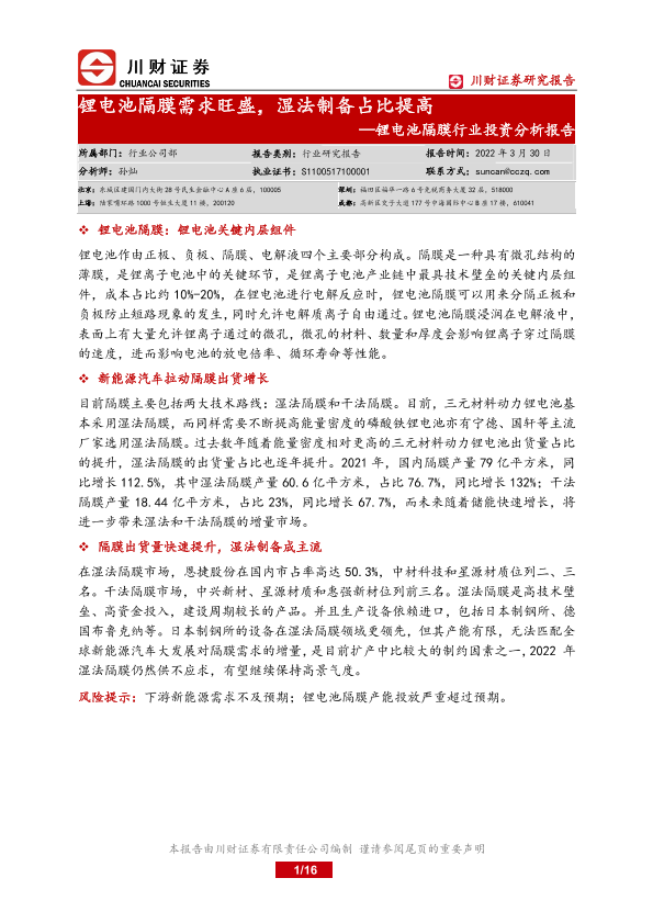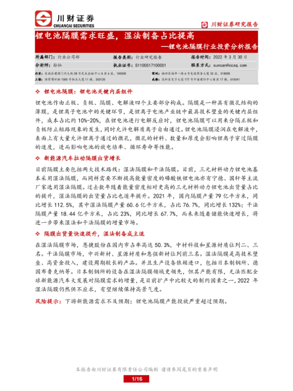 【川财证券】【20220330】锂电池隔膜需求旺盛,湿法制备占比提高-16页