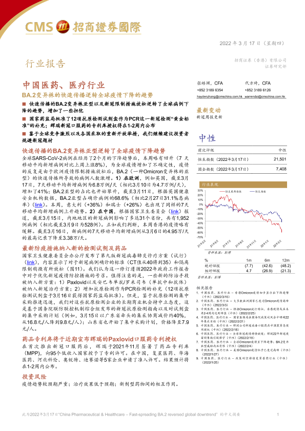 【招商证券国际】【20220317】中国医药、医疗行业:BA.2变异株的快速传播逆转全球疫情下降的趋势-16页