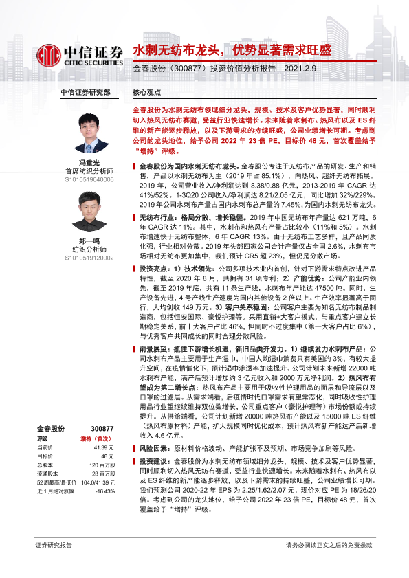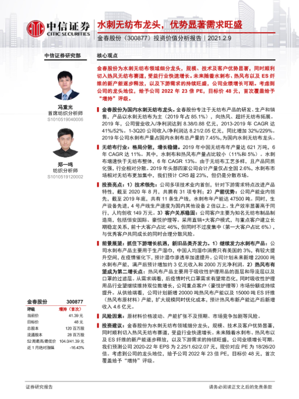 【中信证券】【20210209】2021.02.09-金春股份:水刺无纺布龙头,优势显著需求旺盛-27页
