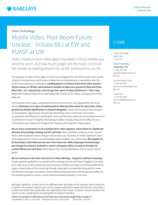 【巴克莱】【20220208】中国视频行业报告:繁荣后的未来尚不明朗-88页