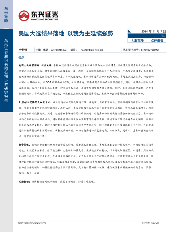 【东兴证券】【20241107】20241111-A股策略点评报告:美国大选结果落地 以我为主延续强势-3页