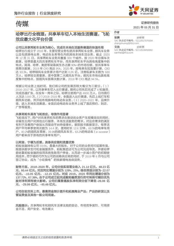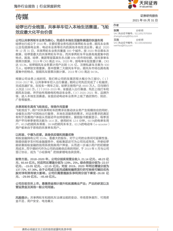 【天风证券】【20210531】2021.05.31-哈啰出行全梳理:共享单车切入本地生活赛道,飞轮效应最大化平台价值-25页