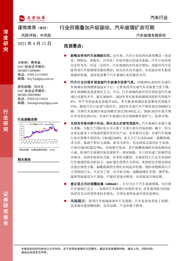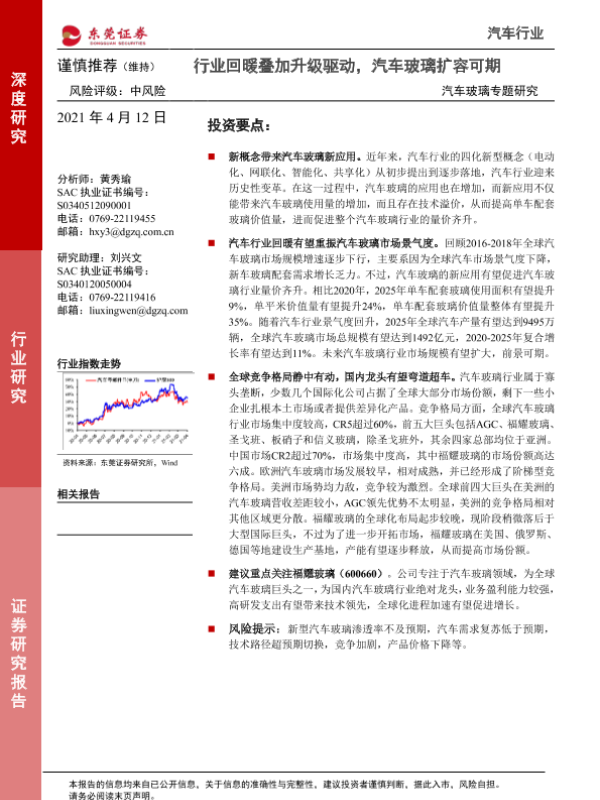 【东莞证券】【20210412】汽车行业汽车玻璃专题研究:行业回暖叠加升级驱动,汽车玻璃扩容可期-35页