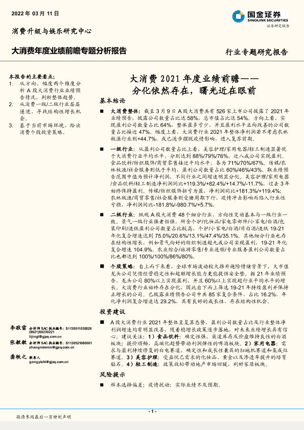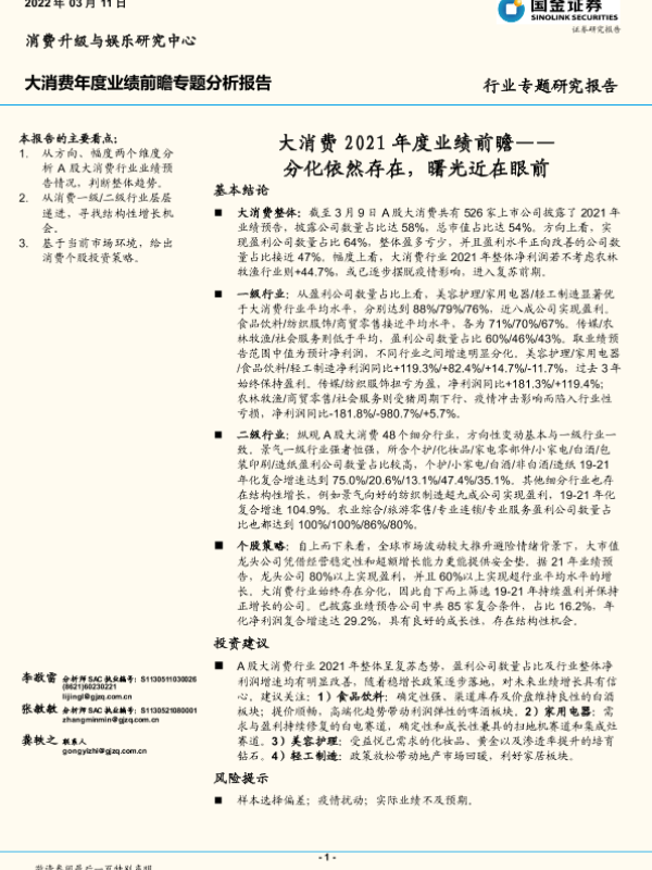 【国金证券】【20220311】大消费行业2021年度业绩前瞻:分化依然存在,曙光近在眼前-25页