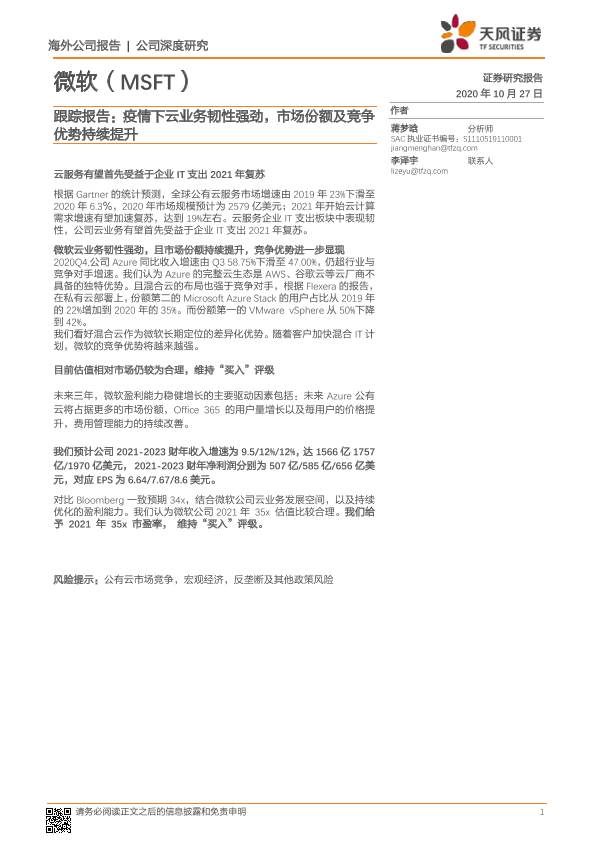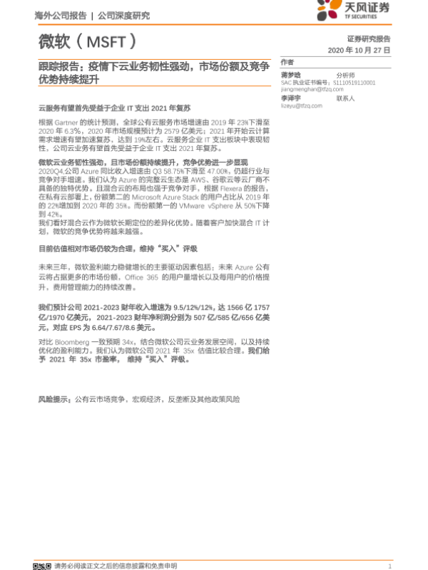 【天风证券】【20201027】2020.10.27-微软-跟踪报告:疫情下云业务韧性强劲,市场份额及竞争优势持续提升-20页