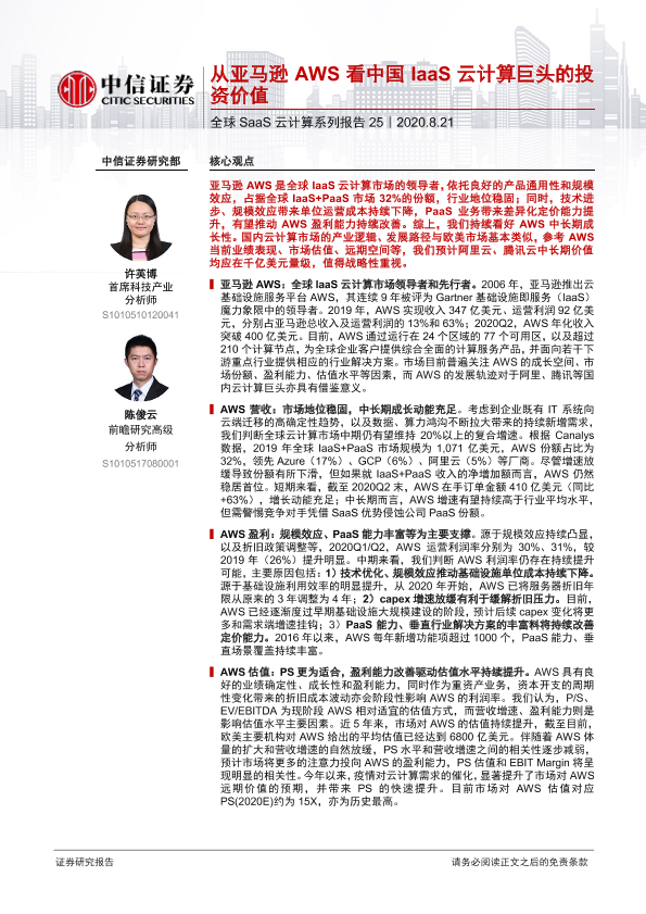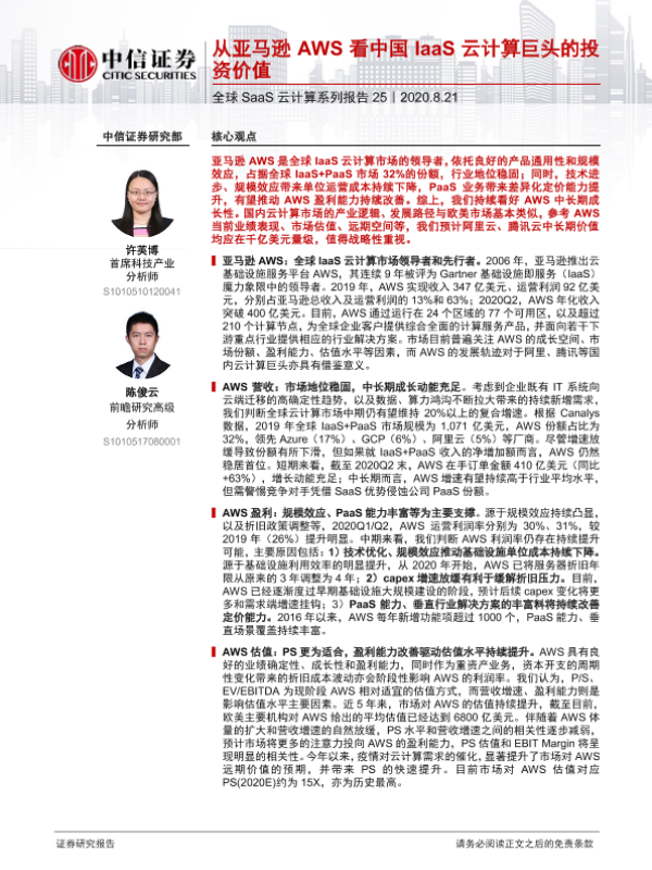 【中信证券】【20200821】从亚马逊AWS看中国IaaS云计算巨头的投资价值-24页