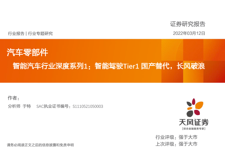 【天风证券】【20220312】智能汽车行业深度系列1:智能驾驶Tier1国产替代,长风破浪-45页