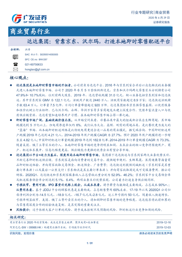 【广发证券】【20200629】达达集团:背靠京东、沃尔玛,打造本地即时零售配送平台-31页