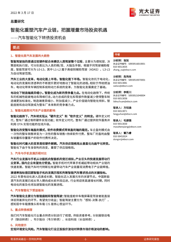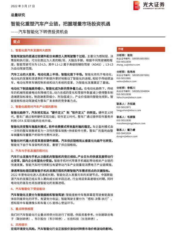 【光大证券】【20220317】汽车智能化下转债投资机会:智能化重塑汽车产业链,把握增量市场投资机遇-22页