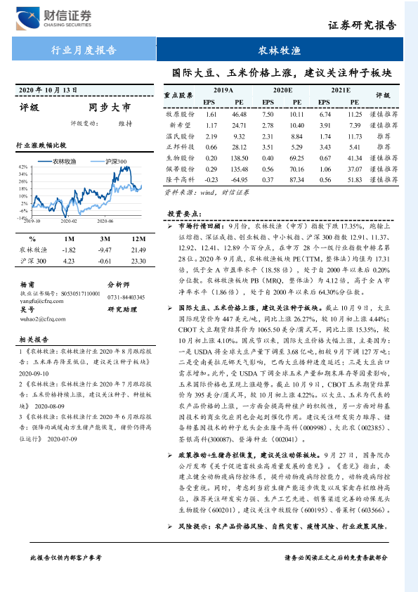 【财信证券】【20201013】2020.10.13-农林牧渔行业月度报告:国际大豆、玉米价格上涨,建议关注种子板块-20页