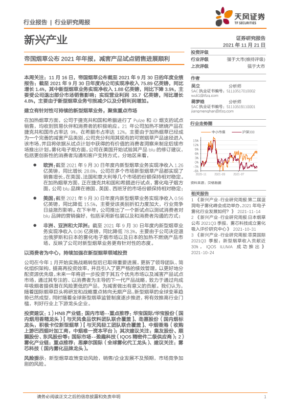【天风证券】【20211122】新兴产业-帝国烟草公布2021年年报-减害产品试点销售进展顺利-5页