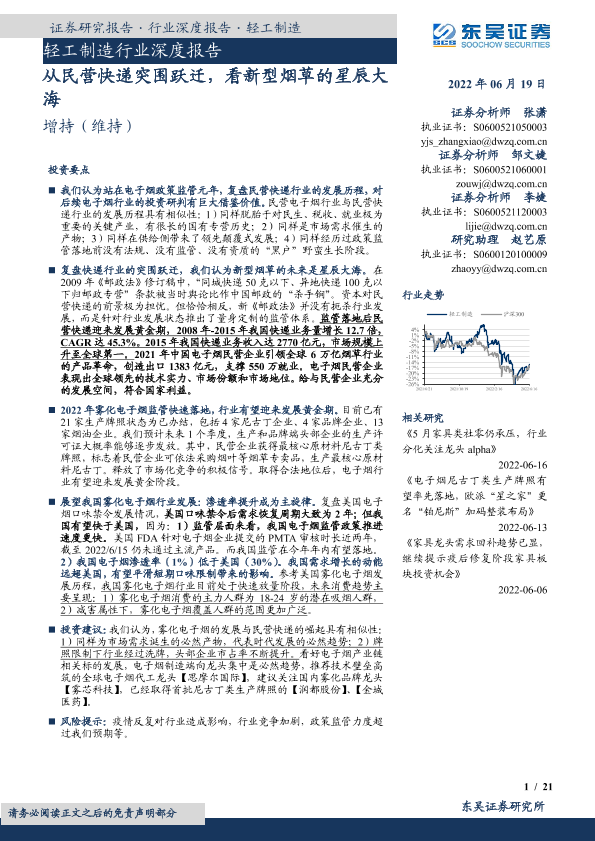 【东吴证券】【20220619】轻工制造行业深度报告-从民营快递突围跃迁,看新型烟草的星辰大海-21页