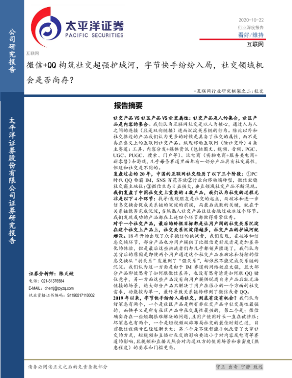 【太平洋证券】【20201022】互联网行业研究框架之二:社交-微信+QQ构筑社交超强护城河,字节快手纷纷入局,社交领域机会是否尚存?-37页