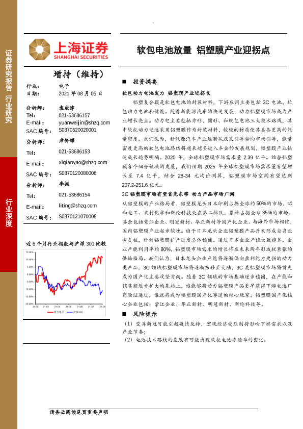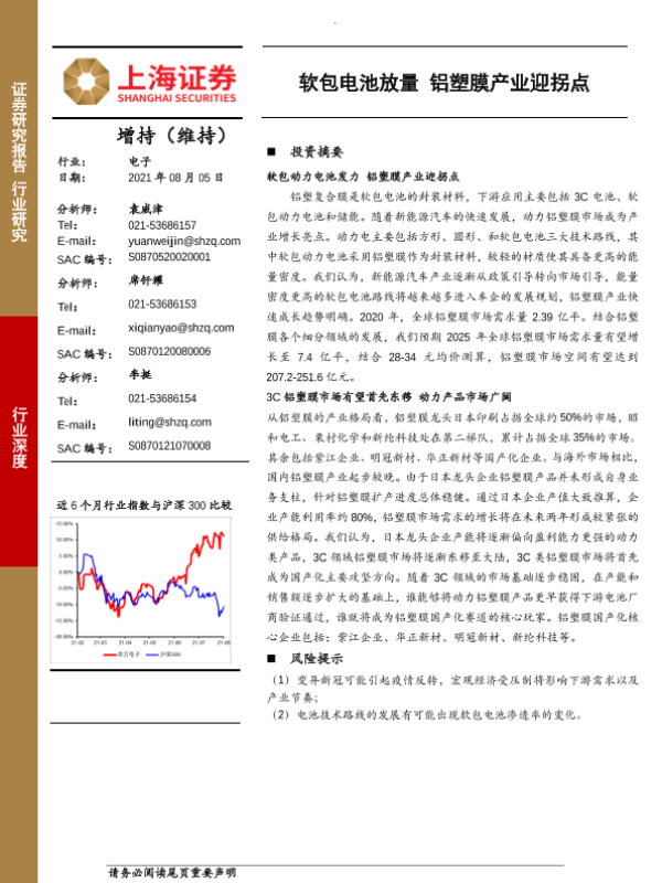 【上海证券】【20210805】电子行业:软包电池放量,铝塑膜产业迎拐点-25页