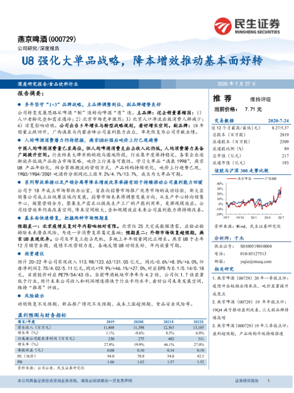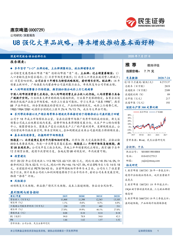 【民生证券】【20200727】燕京啤酒 U8强化大单品战略,降本增效推动基本面好转-23页