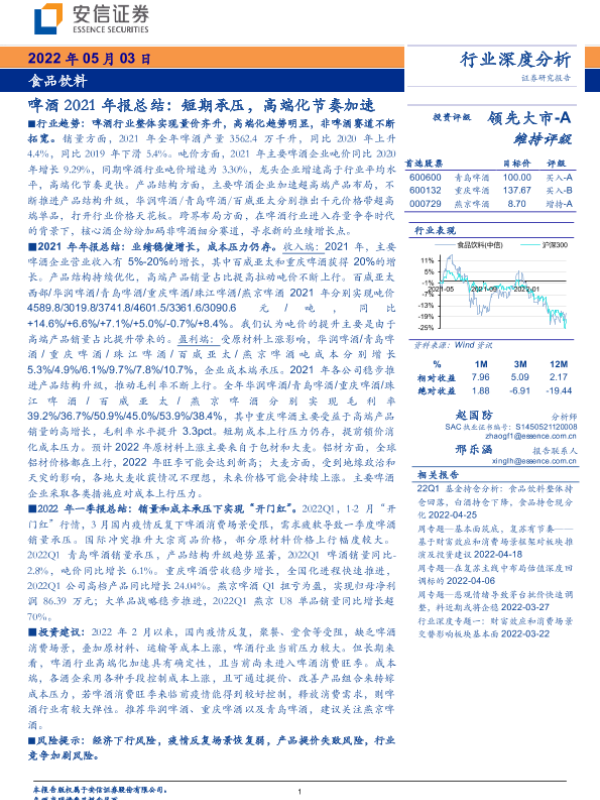 【安信证券】【20220503】2022.05.03-啤酒2021年报总结:短期承压,高端化节奏加速-20页