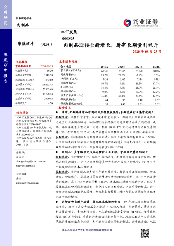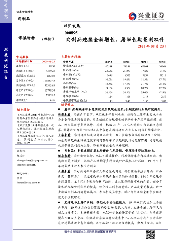【兴业证券】【20200823】2020.08.23-双汇发展:肉制品迎接全新增长,屠宰长期量利双升-26页