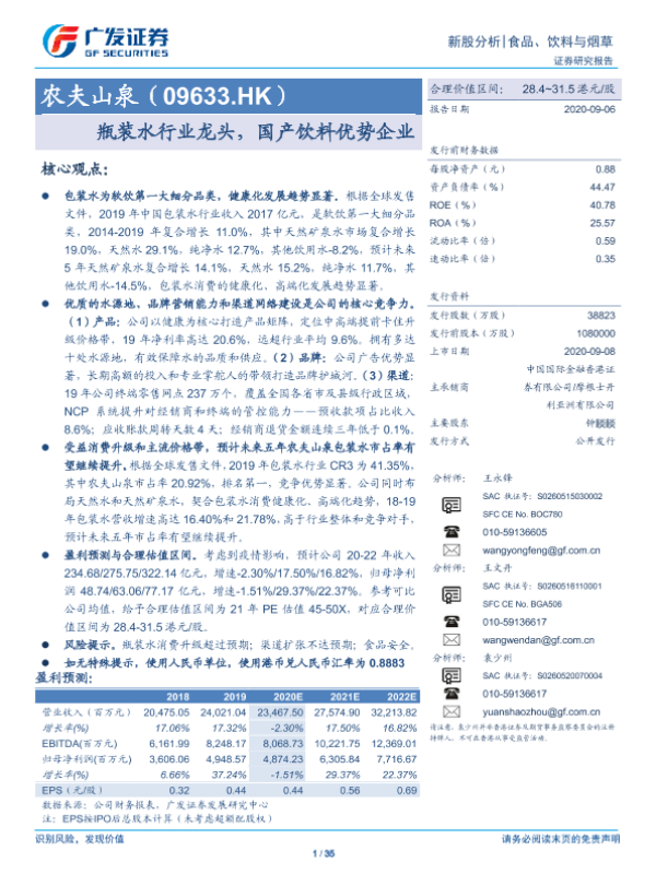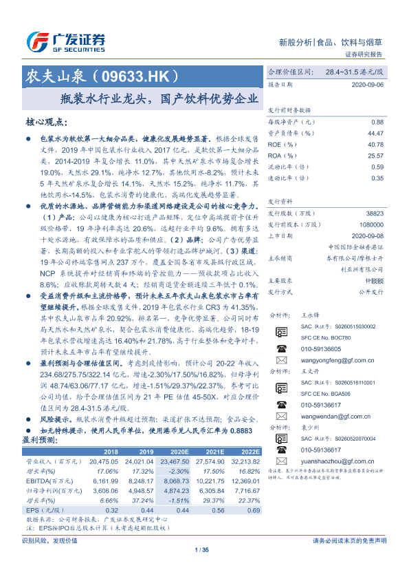 【广发证券】【20200906】农夫山泉:瓶装水行业龙头,国产饮料优势企业-35页