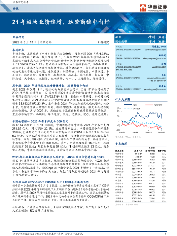 【华泰证券】【20220313】科技行业专题研究:21年板块业绩稳增,运营商稳中向好-23页