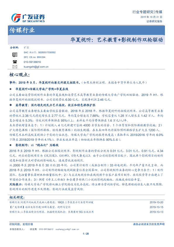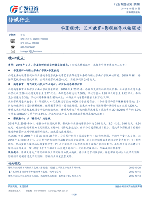 【广发证券】【20191021】华夏视听:艺术教育+影视制作双轮驱动-25页