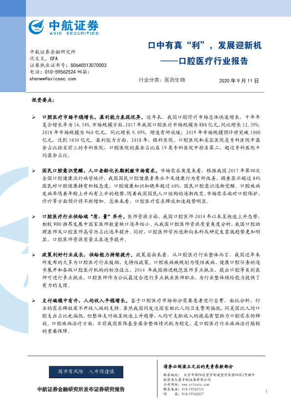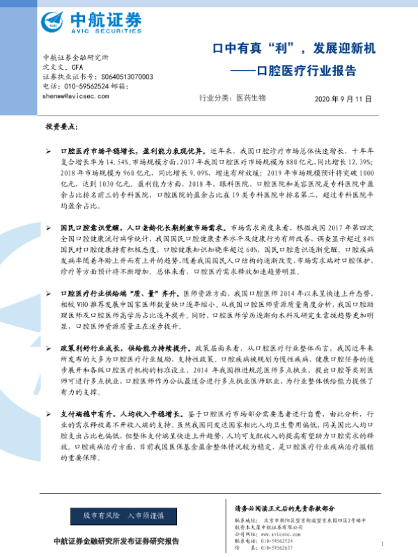 【中航证券】【20200911】2020.09.11-口腔医疗行业报告:口中有真“利”,发展迎新机-22页