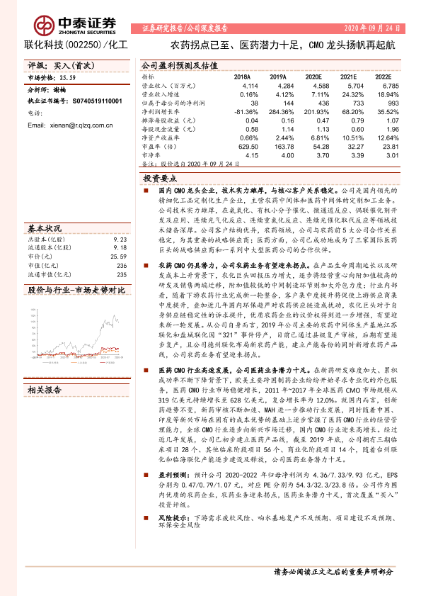 【中泰证券】【20200924】联化科技:农药拐点已至、医药潜力十足,CMO龙头扬帆再起航-29页