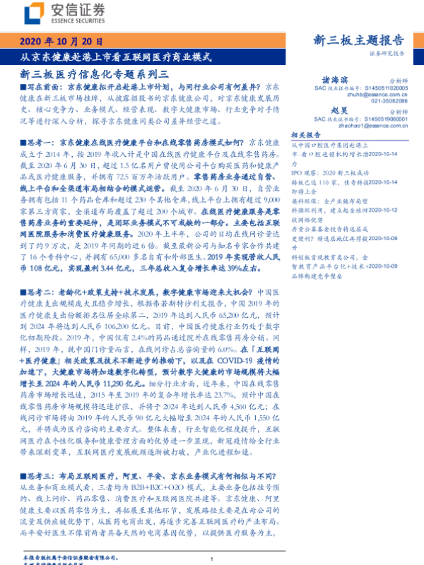 【安信证券】【20201020】2020.10.20-新三板医疗信息化专题系列三:从京东健康赴港上市看互联网医疗商业模式-42页