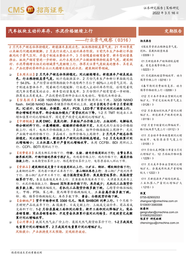 【海通证券】【20220316】行业景气观察:汽车板块主动补库存,水泥价格继续上行-33页