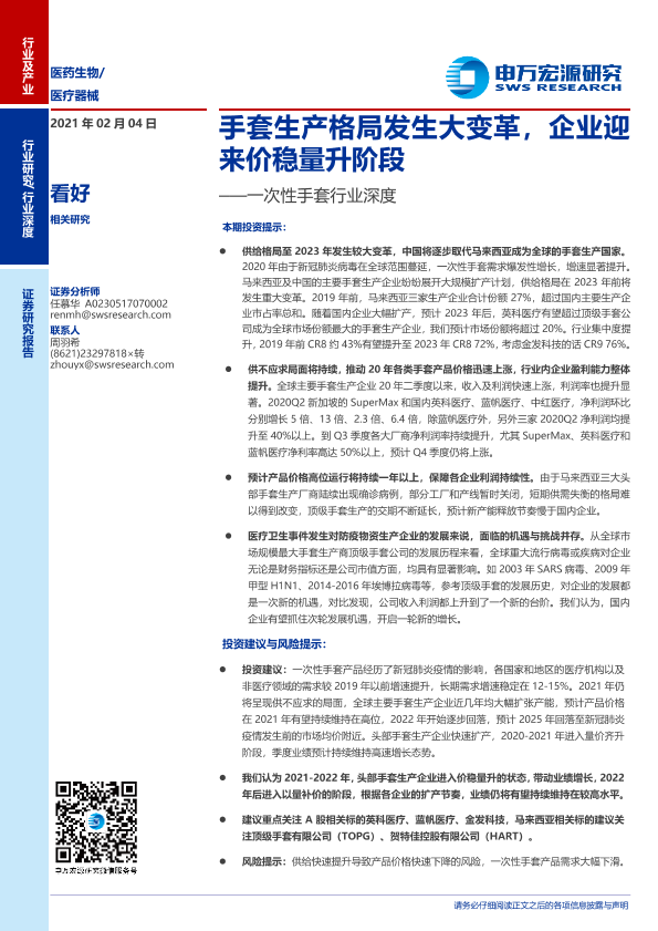 【申万宏源】【20210204】2021.02.04-一次性手套行业深度:手套生产格局发生大变革,企业迎来价稳量升阶段-35页