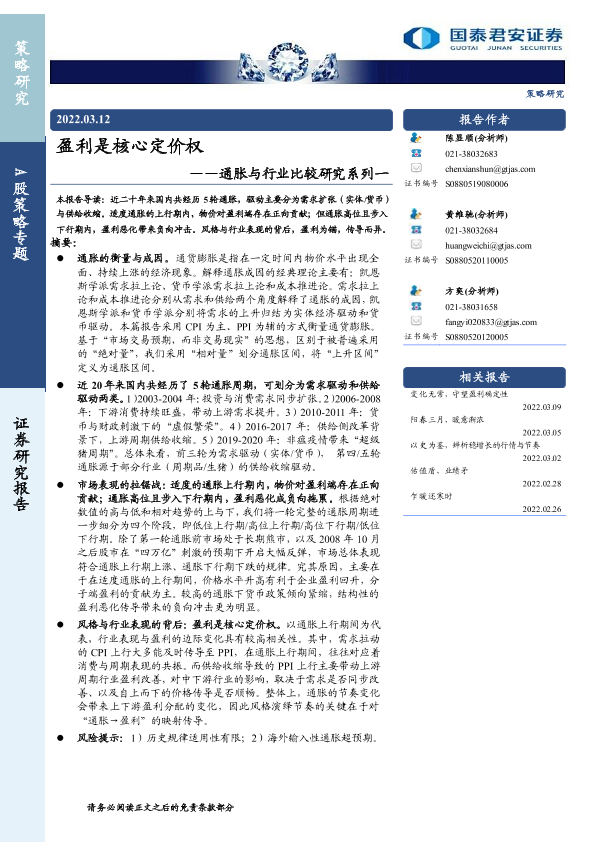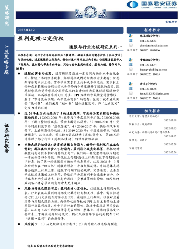 【国泰君安证券】【20220312】通胀与行业比较研究系列一:盈利是核心定价权-16页