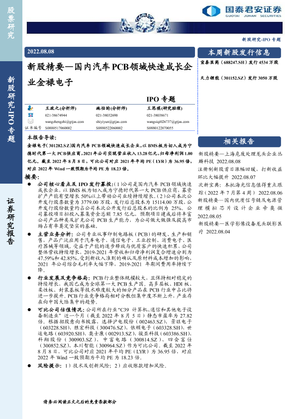 【国泰君安证券】【20220808】新股精要—国内汽车PCB领域快速成长企业金禄电子-7页