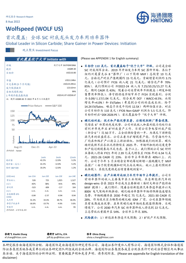 SiC衬底 Wolfspeed 海通国际 车用功率器件 首次覆盖