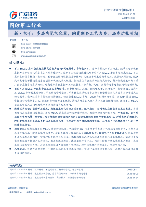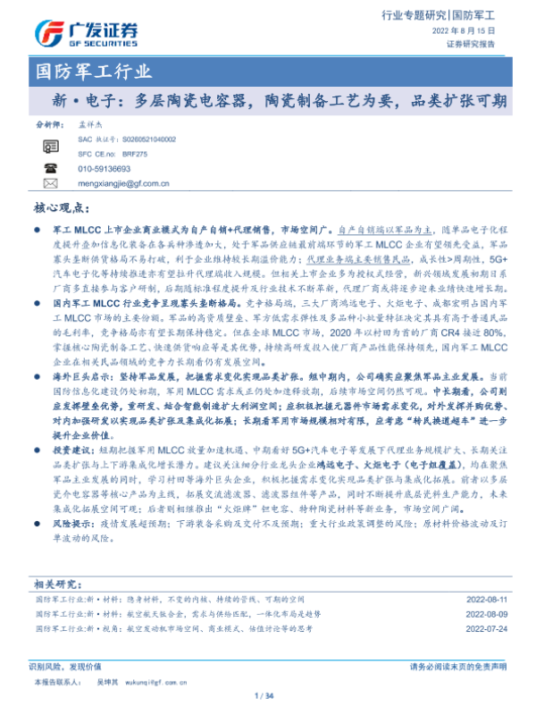 【广发证券】【20220815】国防军工行业新·电子:多层陶瓷电容器,陶瓷制备工艺为要,品类扩张可期-34页