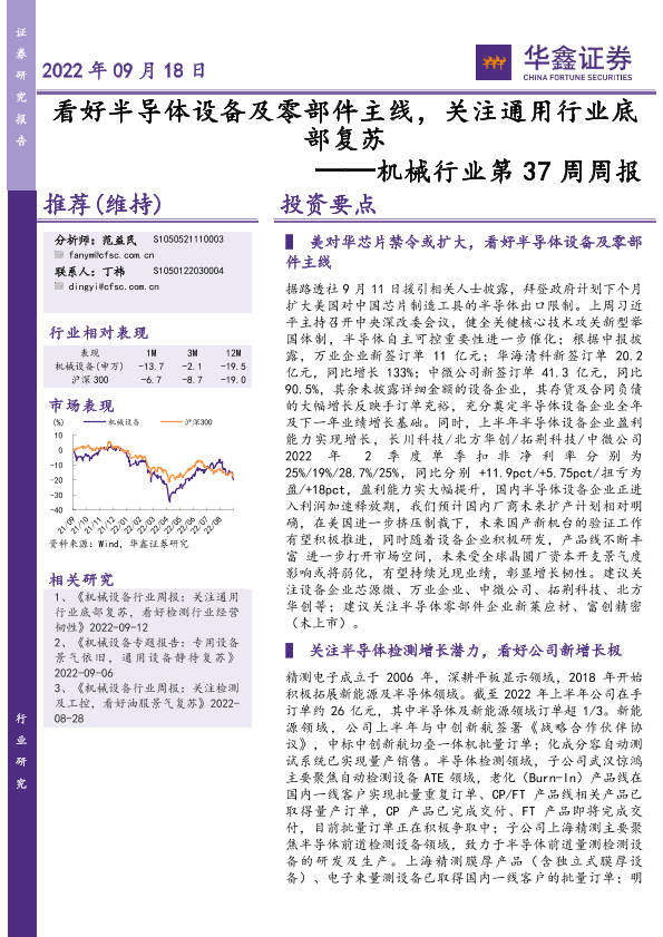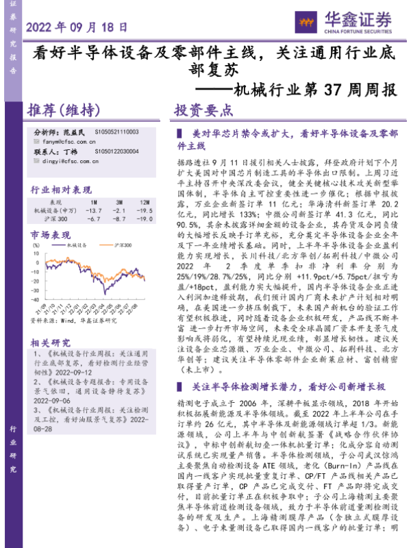 【华鑫证券】【20220918】20220918-华鑫证券-机械行业第37周周报:看好半导体设备及零部件主线,关注通用行业底部复苏-26页