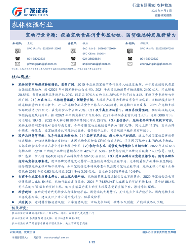 【广发证券】【20220905】农林牧渔行业:宠物行业专题,疫后宠物食品消费彰显韧性,国货崛起铸发展新势力-22页