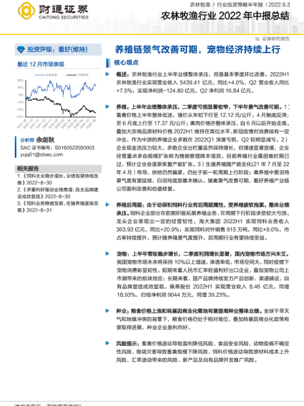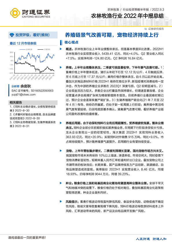 【财通证券】【20220903】农林牧渔行业2022年中报总结:养殖链景气改善可期,宠物经济持续上行-18页