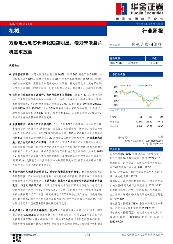 【华金证券】【20220822】机械行业周报:方形电池电芯长薄化趋势明显,看好未来叠片机需求放量-12页