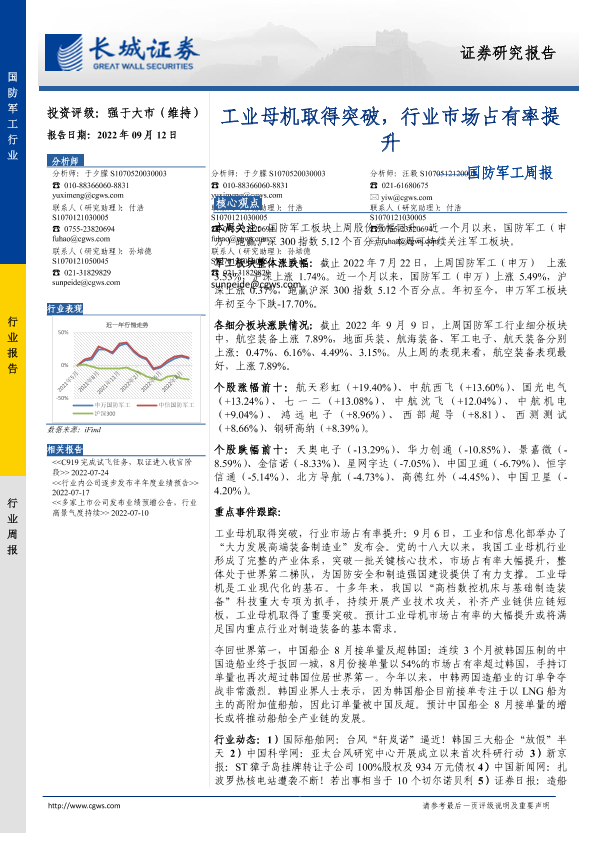 【长城证券】【20220912】20220912-长城证券-国防军工行业周报:工业母机取得突破,行业市场占有率提升-13页