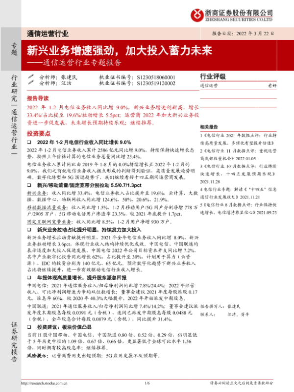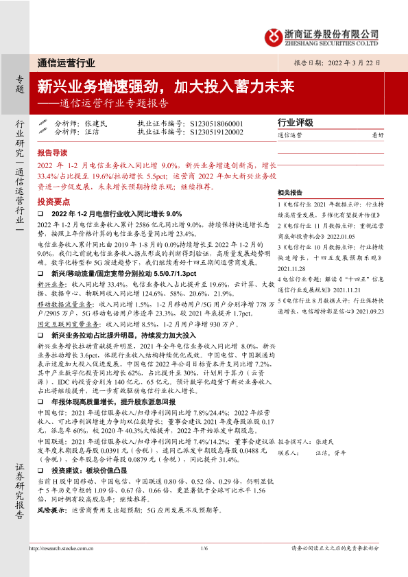 【浙商证券】【20220322】通信运营行业专题报告:新兴业务增速强劲,加大投入蓄力未来-6页