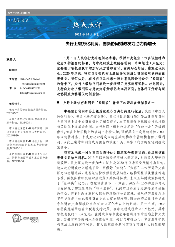 【中诚信国际】【20220309】热点点评:央行上缴万亿利润,创新协同财政发力助力稳增长-3页