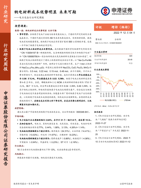 【申港证券】【20221204】电力设备行业研究周报:钠电材料成本优势明显,未来可期-8页