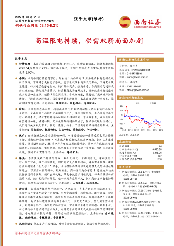 【西南证券】【20220821】20220821-西南证券-钢铁行业周报:高温限电持续,供需双弱局面加剧-18页