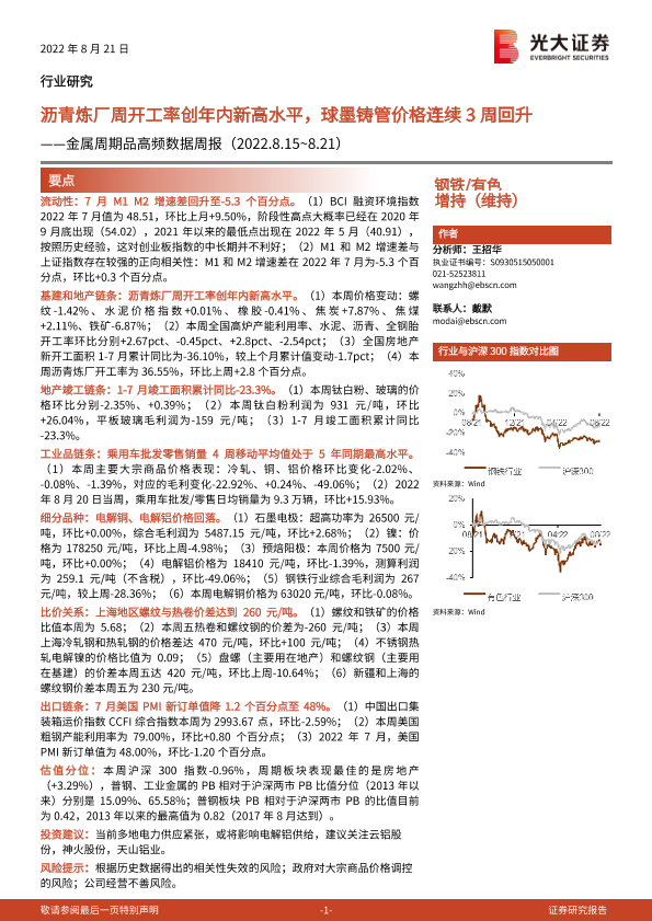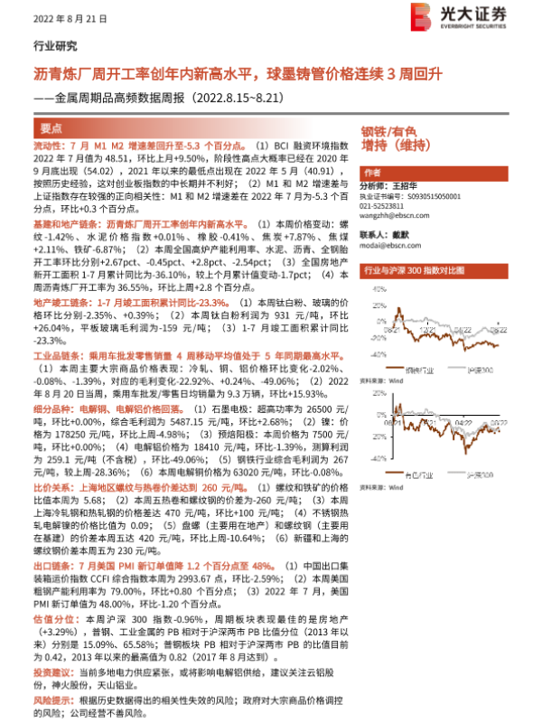 【光大证券】【20220821】20220821-光大证券-钢铁有色行业金属周期品高频数据周报:沥青炼厂周开工率创年内新高水平,球墨铸管价格连续3周回升-26页