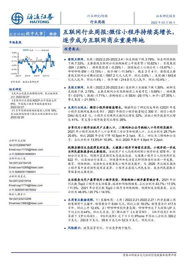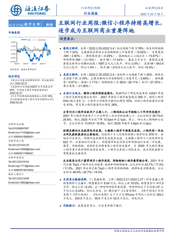 【海通证券】【20220305】20220305-海通证券-互联网行业周报:微信小程序持续高增长,逐步成为互联网商业重要阵地-9页