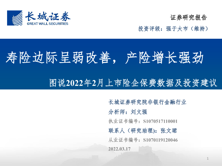 【长城证券】【20220317】非银行金融行业图说2022年2月上市险企保费数据及投资建议:寿险边际呈弱改善,产险增长强劲-29页