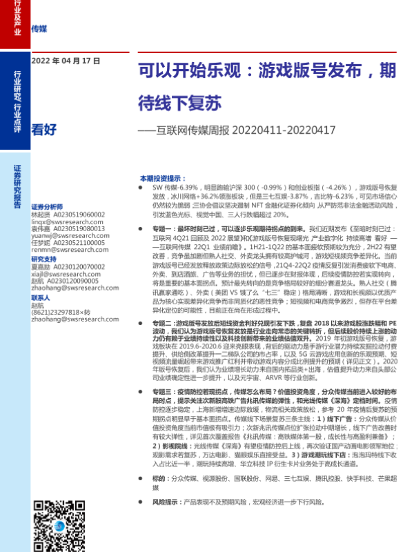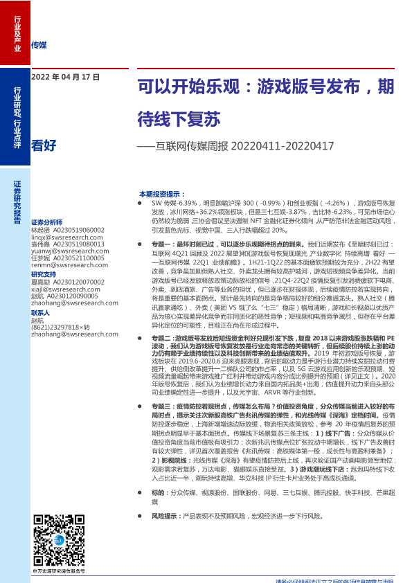 【申万宏源】【20220417】互联网传媒行业周报:可以开始乐观,游戏版号发布,期待线下复苏-29页