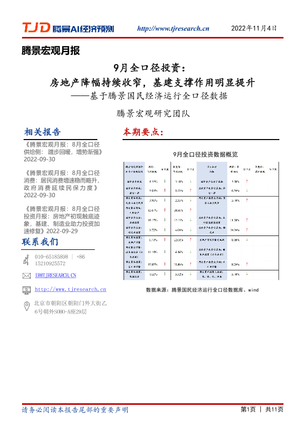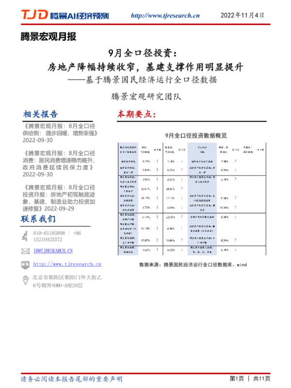 【腾景大数据应用科技研究院】【20221104】基于腾景国民经济运行全口径数据:9月全口径投资,房地产降幅持续收窄,基建支撑作用明显提升-11页